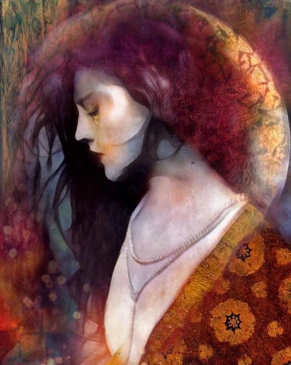 In this work, she is surrounded by the nature of chaos and storm (for witches were known as the "Tempestarii", or those who create storms). Her hair is undone and feral with the wailing of winds which testify and keep account of the wrong which can never be righted. Her head is bowed in sacred pause and silent prayer, and she weeps tears of gold for each act of misogyny suffered, no matter how slight.